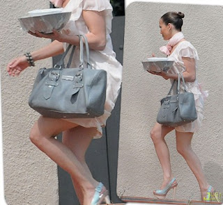 Jennifer had on a pale pink ruffle dress with gray slingback platforms and a pink scarf. She also carried a gray handbag.